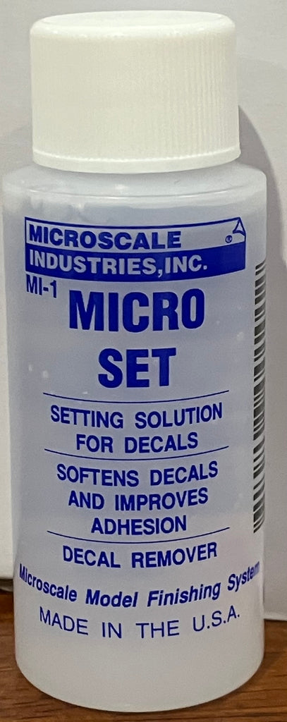 Micro set is a very versatile decal setting solution that does several things to the microscale decals to improve application. Micro set should be applied to the surface of the model where you will be sliding off the decal. Micro set prepares the surface with special wetting agents that cuts the oils in new paint and converts the adhesive on the back of the decal to a stronger and more lasting one. And finally, micro set slightly softens the decals film to make it more flexible so that it can conform better to the model's surface. Better adhesion by the decal to the model prevents tiny air bells from occurring and results in an invisible carrier film or the so called 'painted on look'.