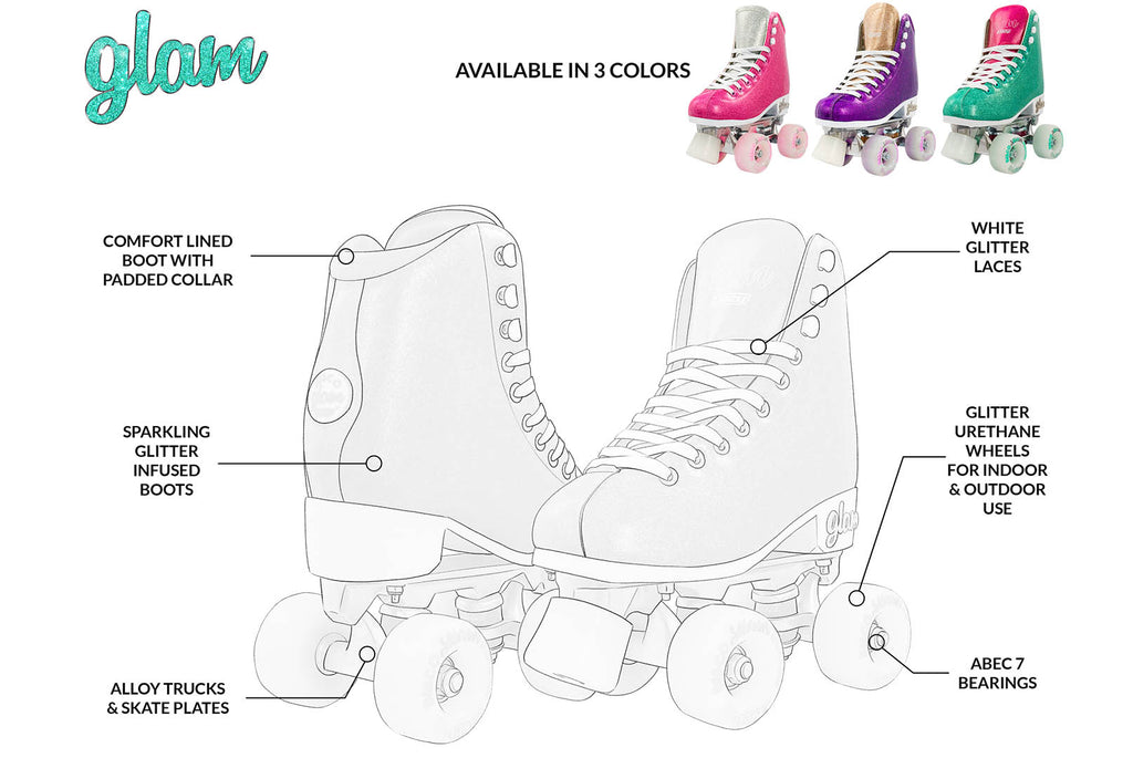 Designed with a classic style infused with a twist, the Glam Roller Skates are brimming with impressive features that prioritize comfort, control, and, of course, glamour. The glittery exterior not only adds a stylish flair but also guarantees durability and protection, ensuring your skates radiate brilliance for years to come..